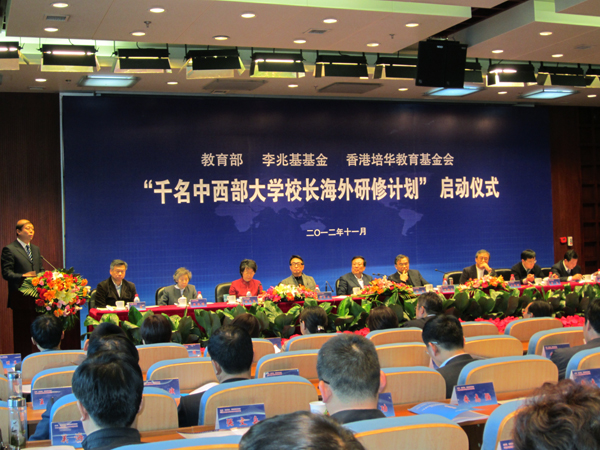 相关链接:“千名中西部大学校长海外研修计划”是国家为落实《国家中长期教育改革和发展规划纲要(2012-2020)》提出的“优化区域布局结构,实施中西部高等教育振兴计划”的要求,配合实施“中西部高等教育振兴计划”,由香港李兆基基金会、培华教育基金会共同捐资与教育部合作开展的项目,自2012年开始,利用5年时间选派千名中西部地方公办高校领导干部赴海外研修学习,以加强中西部地区高校领导干部的办学治校综合能力,提升中西部地方高校办学水平。