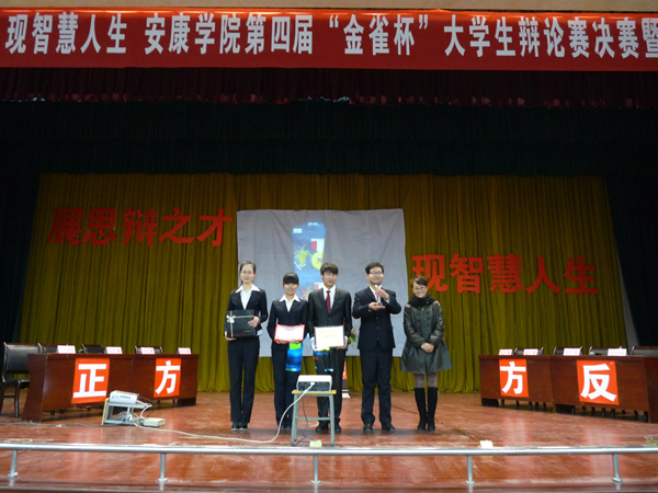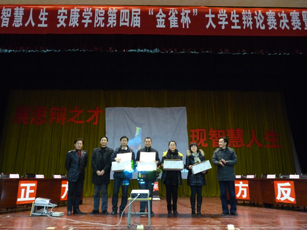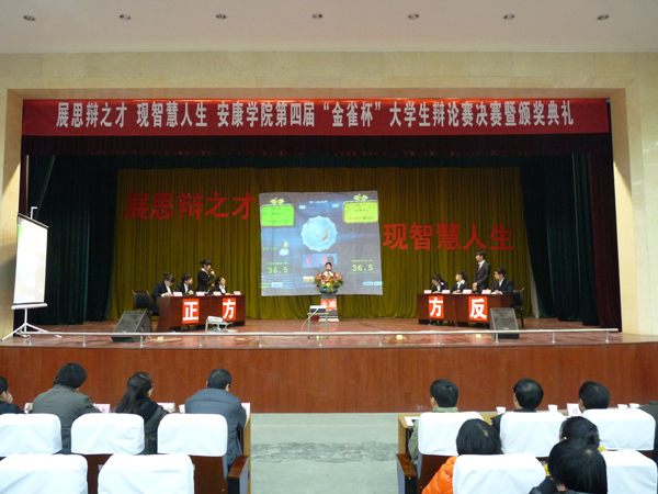 12月21日晚,安康学院第四届“金雀杯”大学生辩论赛决赛暨颁奖典礼在江南校区大礼堂举行。学校党委副书记胡鸿晓教授、学院相关部门负责人、各院系党总支书记、团总支书记、各代表队指导老师及学生代表600余人观看了本次决赛和颁奖典礼。