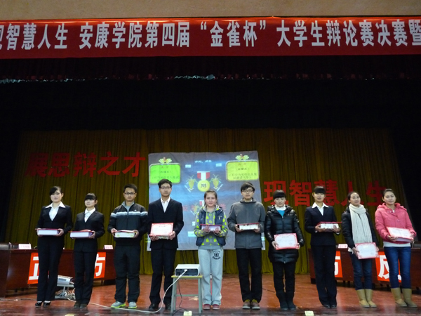 闯入决赛的外语系和经管系代表队围绕“应不应当允许名人免试就读大学”展开的辩论。双方辩手互不相让,并适时抓住对方论据中的漏洞,展开反击,论辩有力,精彩辩论不时引起师生的阵阵掌声和叫好声。最终经管系以3.3分的优势获得了本次辩论赛的冠军——金螳奖,外语系获得亚军——金雀奖。