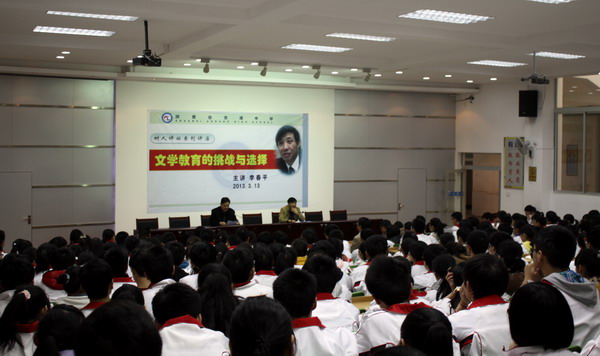 李春平针对安康中学学生文学爱好者众多,阅读面广、思维活跃的特点,精心的准备了一场名为《文学教育的挑战与选择》专题讲座。在讲座中,李春平结合自己多年的创作体会,从文学教材、学生作文、网络文学、经典阅读等四方面,给到场广大师生做了精彩独到的讲解。在热烈的交流互动过程中,李春平还亲切解答了现场学生提出的各项问题。高屋建瓴的见地,生动风趣的言辞,受到了在场同学的热捧。现场提问络绎不绝,热烈掌声不时响起。有的同学还情不自禁的站起来,庄严郑重的向李教授致以自己的军礼。