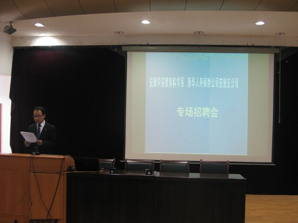 日前,教育科学系邀请新华人寿保险安康支公司来我院举办了“教育科学系 ● 新华人寿保险安康支公司专场招聘会”。新华人寿保险安康支公司人才培训部陈经理了就公司的发展现状和招聘岗位、要求、员工的个人发展前景等向毕业生做了详细介绍。毕业生们就自己关心的公司用人制度、各部工作职责、工资福利待遇、员工培训学习等情况与新华人寿保险安康支公司各部门经理就进行了深入的交流。招聘会现场,十余名同学签订了“应聘意向书”。
