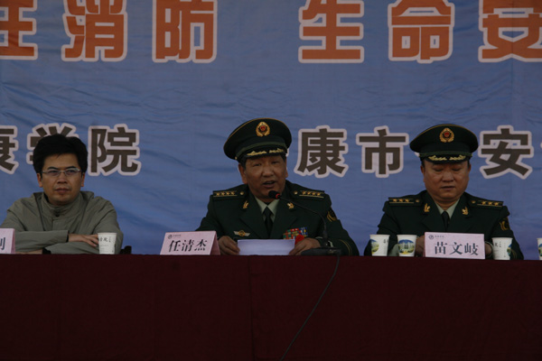 11月9日下午,我院与安康市公安消防支队在学院东校区操场联合举办消防知识讲座暨防火、灭火、疏散自救演练活动。省消防总队副总工程师任清杰、 安康市消防支队支队长苗文岐、安康市消防支队政委叶良志、安康学院副院长陈刚等领导出席了演练活动,演练活动由保卫处处长高立平主持。