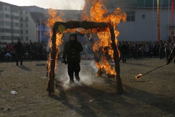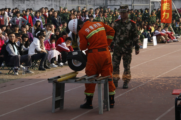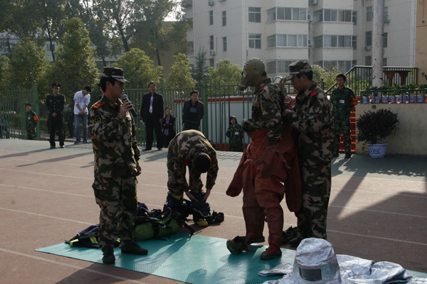 在演练活动上,副院长陈刚做了动员讲话。安康公安消防支队消防处参谋李波同志给师生详细讲解了防火、灭火、自救、逃生、疏散等方面的知识和技巧;汉滨消防中队的战士们给广大师生讲解演示了十余种消防特种器材的构造和使用方法,进行了穿越火墙表演;随后,进行了现场灭火演练,校卫队员、部分管理服务部门教工、学生代表亲自实践了灭火器的使用;60余名学生护校队员和205名新生在学生宿舍4号公寓楼参加了 “模拟火灾”疏散演练。最后,省消防总队副总工程师任清杰同志点评了本次消防演练活动,对我院的消防安全工作给与了充分的肯定,同时希望师生进一步深入学习消防法律、法规,强化消防安全意识,增强师生防火疏散逃生能力,推进平安校园建设。
