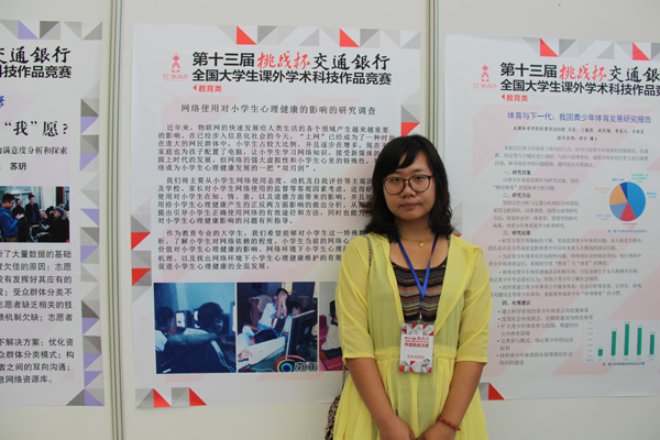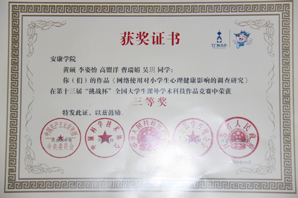 10月13日——17日,第十三届挑战杯全国大学生课外学术科技作品竞赛决赛在苏州大学举行,我校教育科学系黄硕、李姿怡、高盟洋、曹瑞娟、吴玥等5名同学的作品《网络使用对小学生心理健康影响的调查研究》通过作品现场展示、封闭评审等环节最终获得三等奖。