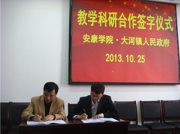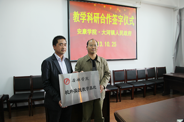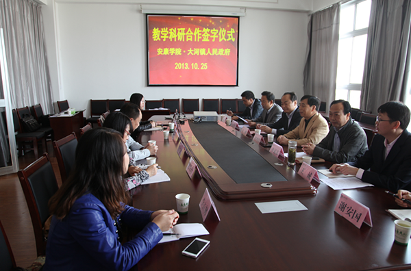 10月25日上午,安康学院与大河镇人民政府教学科研合作签字仪式在我校江南校区图书馆六楼陕南民间文化研究中心会议室举行。校党委副书记胡鸿晓,合作与发展处处长单福东,政治与历史系主任何家理、党总支书记谢安国、副主任单林波,大河镇党委书记邹峰、镇长王诚、副书记刘长平等出席签字仪式。仪式由何家理主持。