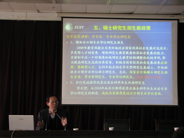 任工昌教授从十三个方面介绍了2011年国家硕士研究生招生考试录取相关政策,并就如何做好研究生考试准备、复习及网报等具体环节进行了详细讲解,在谈到考研过程的细节时,任教授强调,考研的学生首先应深刻分析自我的优势和劣势,选定好目标,目标选定后要合理分配时间,认真复习,精心备考。