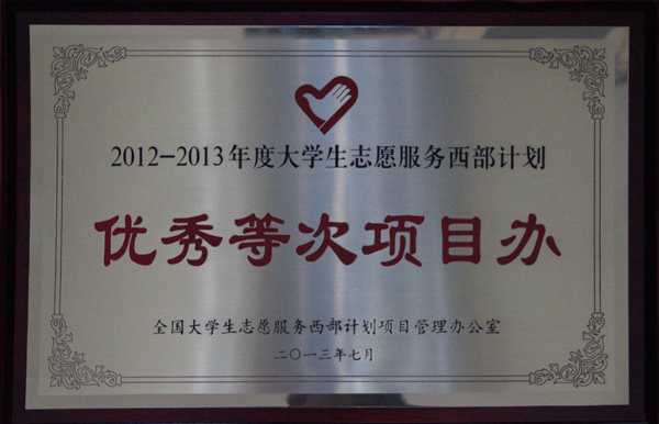今年是“西部计划”实施十周年,为深入学习贯彻习近平总书记“五四”重要讲话精神,按照团的十七大关于“继续抓实抓好”西部计划的有关要求,共青团中央、全国大学生志愿服务西部计划项目办共同组织评选了2012—2013年度大学生志愿服务西部计划绩效考核优秀等次服务县和高校项目办。我校被评为 “优秀等次项目办”,全国共有北京大学等211所高校获此殊荣。