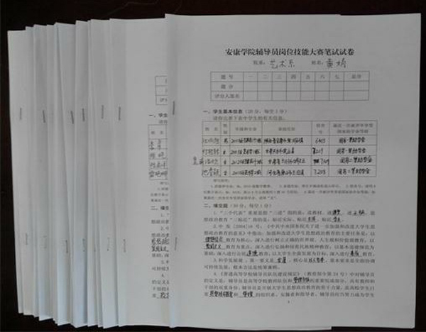 此次闭卷笔试主要是考察辅导员开展学生工作应具备的业务知识和认识、分析、解决问题的能力以及处理学生事务的基本技能,内容涉党的基本理论、学生教育管理的政策、理论、法规、制度以及学生基本信息、帮困资助、心理健康、违纪处理、稳定安全教育、情景案例分析、实用文写作等方面。其中学生基本信息主要是考察辅导员对所带学生基本情况的熟悉程度,辅导员根据试卷上所给学生姓名,要现场填写出学生性别、年级专业、家庭住址、所住宿舍号、家庭经济状况、奖惩情况等。
