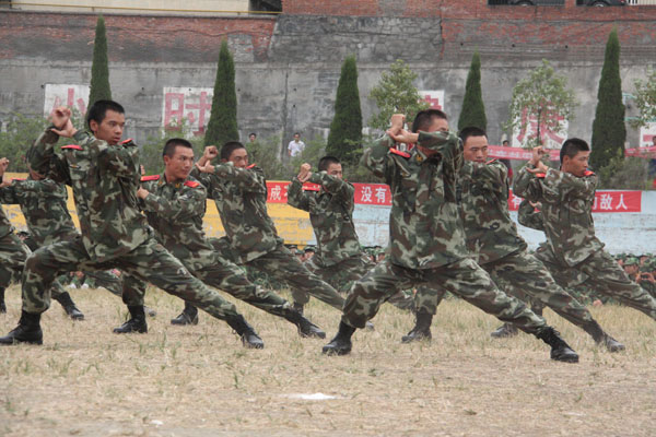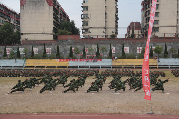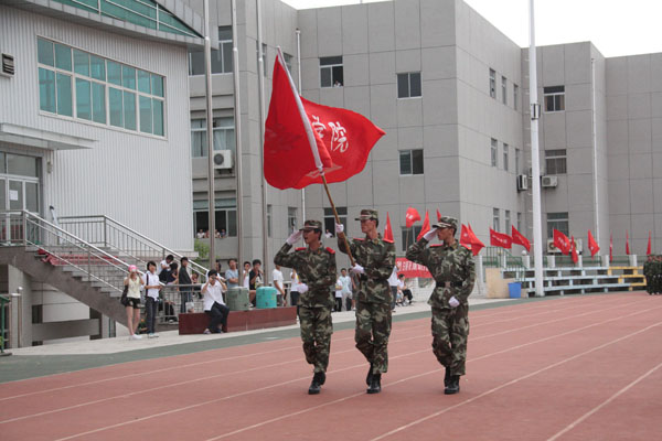 王兴林院长在徐信军大队长的陪同下,检阅了受阅方队。领导亲切的问候和同学们铿锵有力的回应,如海浪般澎湃在学校的上空。随后,33个方队分列式入场,同学们士气高昂,步伐整齐,口号嘹亮,依次通过主席台,接受检阅。军训标兵连进行了队列表演和军体拳表演。承训部队教官的擒敌拳表演更是赢得了全场喝彩。