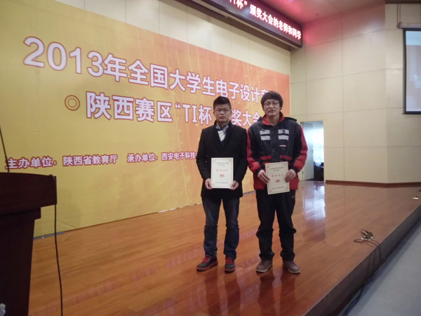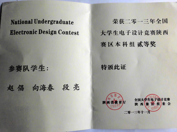 12月29日,全国大学生电子设计竞赛陕西赛区颁奖典礼在西安电子科技大学新校区举行,我校电子信息工程专业11级学生赵倡、段亮、向海春同学制作的手写绘图板(G题)获得本科组二等奖,所取得的成绩是我校2009年参加的三届全国大学生电子设计竞赛以来最好的一届,是我校首次在本科组获得该项赛事的奖项。