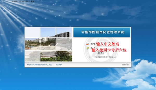 进入学校首页,点击“校园直通”栏目第三行右侧“校情民意”进入登录页面,账号为登录者的真实中文姓名,原始密码为校园卡号后6位数字,登录后可自行修改密码。