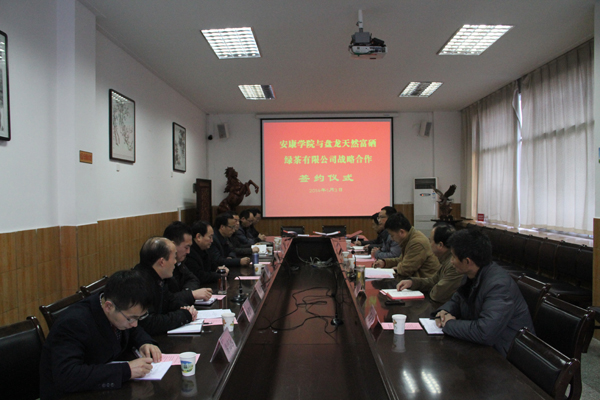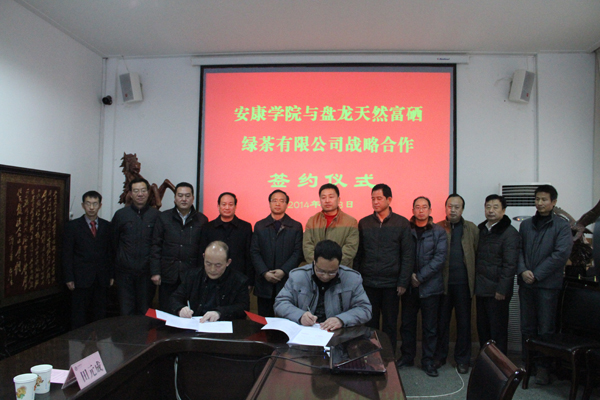 2014年1月3日,安康学院与紫阳盘龙天然富硒绿茶有限公司战略合作签约仪式在我校举行。安康市副市长鲁琦、市农业局局长崔用慧、市林业局局长李本增、市供销合作社主任李云健、紫阳县副县长刘济兵等政府、部门领导参加了签约仪式。仪式由安康学院副校长向纪明主持,紫阳盘龙天然富硒绿茶有限公司董事长孙洪军、安康学院党委书记杨涛分别代表合作双方讲话。