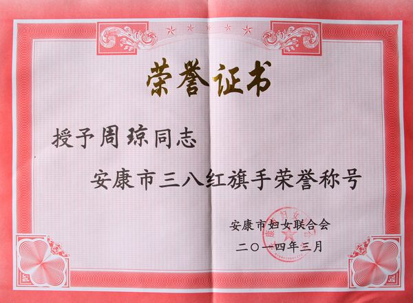 日前,安康市妇女联合会发文《关于授予李颉等47人安康市三八红旗手、汉滨区人民法院未成年人暨家庭暴力合议庭等17个单位安康市三八红旗集体荣誉称号的决定》(安妇发〔2014〕21号),我校化学化工系教师周琼被授予安康市三八红旗手称号。