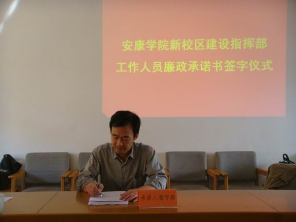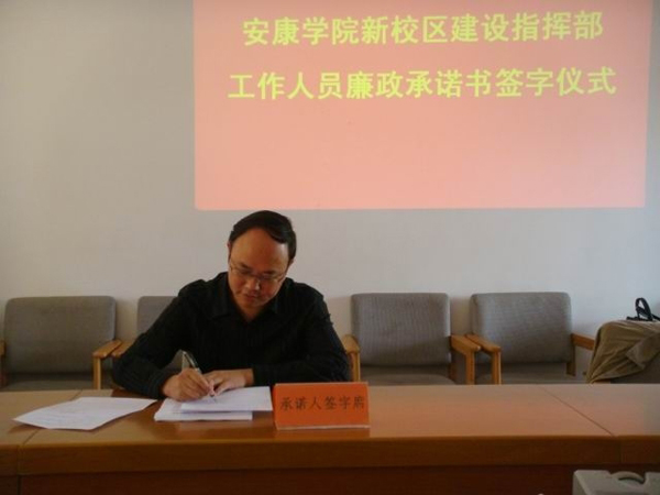 5日上午,胡鸿晓主持会议,对新校区建设中加强党风廉政工作的重要性和紧迫性作了强调,并就如何抓好党风廉政工作提出了具体要求。新校区建设指挥部监审办公室主任王新民同志组织与会人员,学习了中共中央办公厅国务院办公厅印发《关于开展工程建设领域突出问题专题治理工作的意见》、教育部《关于印发<教育部关于严禁领导干部违反规定插手干预基本建设工程管理行为的若干规定>的通知》等文件,传达了教育部召开的工程建设领域突出问题专项治理工作视频会议精神。指挥部领导及全体工作人员在《安康学院新校区建设工作人员廉政承诺书》上郑重签名。