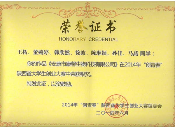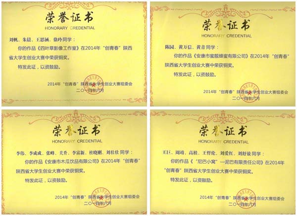6月23日下午,由团省委、省委高教工委、省学联、西安高新区管委会共同主办,西北工业大学承办的2014年“创青春”陕西省大学生创业大赛在西北工业大学国际会议中心圆满落下帷幕。我校择优推荐了14件作品参加陕西省大学生创业计划竞赛。省赛经过初评、书面评审、秘密答辩等环节评出了金银铜奖。我校共有六个项目获奖,其中银奖2项,铜奖4项。同时学校被授予“优秀组织奖”, 我校已连续3年获得此项荣誉。