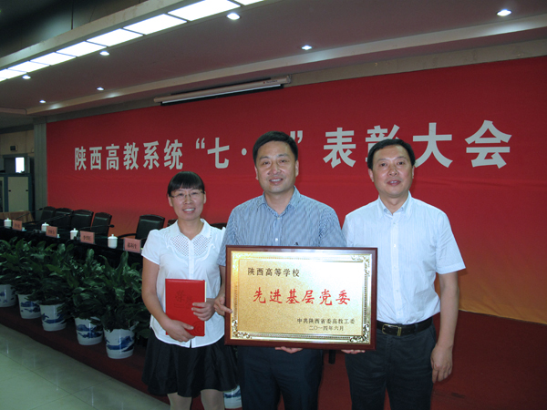 7月1日下午,陕西省高教工委庆祝建党93周年暨先进表彰大会在西安举行,我校获得多项表彰。其中,学校党委被授予“先进基层党委”荣誉称号,经济与管理系党总支被授予“先进基层党组织”荣誉称号,电子与信息工程系老师杨亦云、图书馆技术服务中心主任刘志军被授予“优秀共产党员”荣誉称号,外语系党总支书记李延福被授予“优秀党务工作者”荣誉称号。(见《关于表彰陕西高等学校先进基层党组织、优秀共产党员和优秀党务工作者的决定》<陕高教组〔2014〕37号>)
