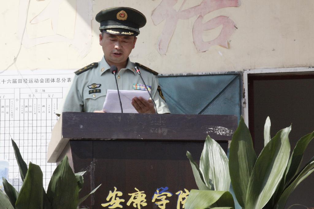 武警安康支队政委徐信军代表承训部队发言。他希望参训学员要以军人的标准严格要求自己,尊重教官,服从命令,听从指挥。要发扬我军战士吃苦耐劳、艰苦奋斗的大无畏革命精神,团结互助,共同提高,形成争创一流的良好军训氛围。