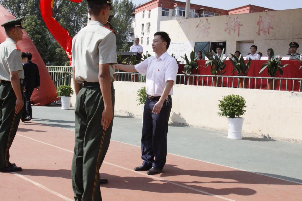 最后,党委书记杨涛为本次军训师授旗。红旗猎猎,迎风招展,我校2014级新生的大学生活暨为期12天的军训生活全面展开。