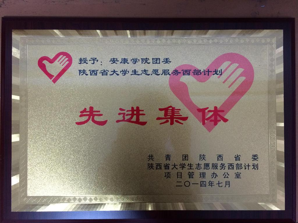 近日,从共青团陕西省委获悉,在2013——2014年度陕西省大学生志愿服务西部计划先进集体评选中,我校荣获“陕西省大学生志愿服务西部计划先进集体”称号。此次受到表彰的“陕西省大学生志愿服务西部计划先进集体”总计20个,市级项目办3个、县级项目办11个、高校项目办6个。