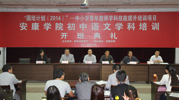 9月15日上午,“国培计划(2014)”——陕西省中小学优秀青年教师学科能力提升培训项目初中语文学科培训班开班典礼在我校图书馆六楼学术报告厅举行,项目负责人、继续教育学院院长王永东致辞,项目首席专家、中文系主任戴承元教授讲话,“国培计划”项目实施办公室主任刘连德主持会议。