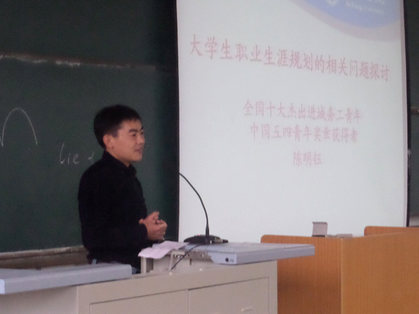 9月15日下午,全国十大杰出务工青年、第11届全国五四青年奖章获得者、安康市最美十佳安康人、社会工作专业外聘实践教学指导教师陈明钰应邀为我校政史系大一新生做了题为“大学生职业规划的相关问题探讨”的学术讲座。