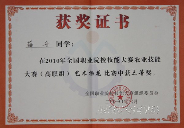 我校农学与生命科学学院园林技术专业2007级1班的薛丹同学(指导教师:吴飞、廖咸康)在今年4月份举行的“首届全国农业职业院校职业技能大赛陕西省选拔赛”中获得第一名,经组委会直接推荐参加此次比赛,最终获得高职组三等奖。