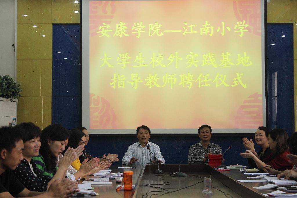 10月10日下午,江南小学校外实践教学指导教师聘任仪式在江南小学会议室举行,安康学院党委副书记胡鸿晓教授、教育科学系黄路阳教授、陈珂老师、江南小学副校长史蓉等出席了聘任仪式。胡鸿晓在仪式上强调,安康学院培养的是应用型人才,学生在校不仅要学习理论知识还要将理论运用在实践中,小学教育专业培养的是未来的小学教师,因此,就应该在小学多实践,希望同学们能多看、多听、多问,珍惜机会,虚心向指导教师学习,在实践中提高自己。