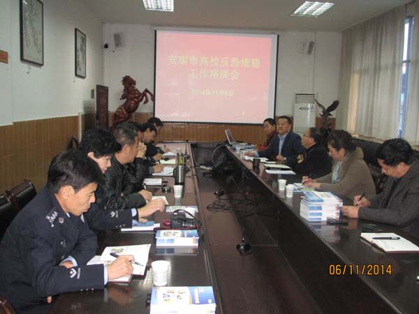 为贯彻省教工委、教育厅、公安厅反恐维稳专题会议精神,11月6日,安康市召开高校反恐维稳工作座谈会,会议在我校举行。市公安局副局长雷绍眀、经文保支队长杨斌、反恐支队长刘斌、汉滨公安分局副局长熊海波、高新公安分局副局长康厚乾、安康职业技术学院党委副书记张慧丽、我校副校长杨行玉等出席会议。会议由雷绍眀主持。