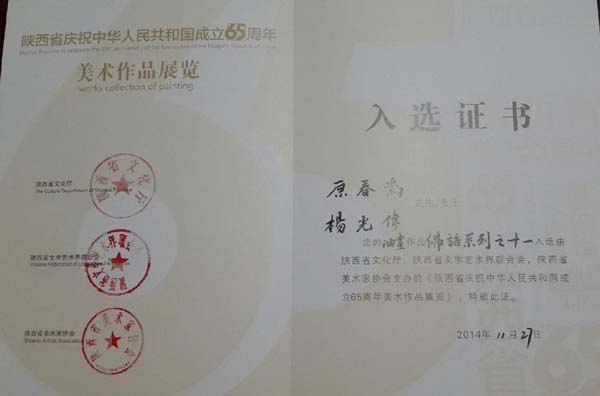 近日,由我校艺术系教师党天才创作的水彩画《柿子红了》、章长青创作的国画《回家》、原春鸣创作的油画《佛语系列之十一》(与杨光伟合作)、骆阳创作的油画《陕南映像》,外聘教师卜嘉艺创作的版画《革命文物》、王关棣创作的国画《带梦远行》入展由陕西省文化厅、省文联、省美协主办的“陕西省庆祝中华人民共和国成立65周年美术作品展”,其中党天才、章长青、卜嘉艺的美术作品被推选参加十二届全国美术作品展览。