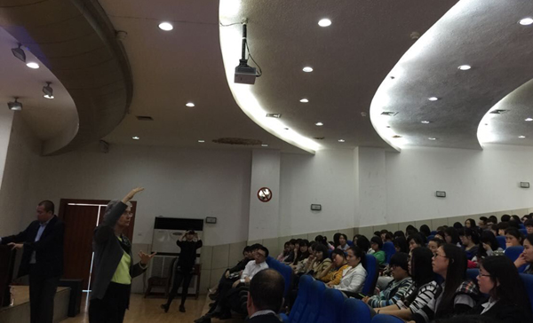 会谈结束后,PENELOPE PYNES博士一行在一号教学楼六楼报告厅为我校师生进行了一场有关UNCG及美国本科教育模式的报告会,就学生感兴趣的问题,如签证、工作、专业、学费等问题与在场学生进行了交流。