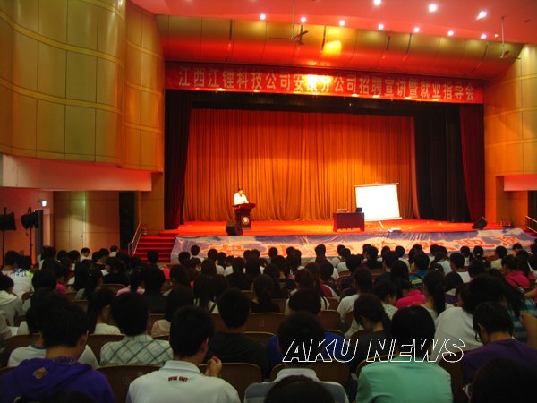 经安康市政府推荐,我院学生就业处与安康市高新技术产业开发区管委会积极联系,6月1日下午4时,江西江锂科技公司、陕西天沐新材料有限公司在我院西校区大礼堂举行了招聘宣讲及就业指导会。学院党委副书记胡鸿晓、安康市高新技术产业开发区管委会主任李春庆、江西江锂科技公司副总经理陶仕华、陕西天沐新材料有限公司副董事长李文山和我院1000余名学生参加了大会。大会由学院学生就业处处长丁义国主持。 胡鸿晓代表学院致欢迎辞,并鼓励我院广大毕业生积极投身到区域经济建设之中。李春庆介绍了安康市高新技术产业开发区基本情况以及依托安康市矿产资源优势引进高新技术企业的发展规划;陶仕华介绍了江西江锂科技公司的发展历程,并做了简短精彩的大学生职业规划建议;李文山就本次招聘活动做了安排,并回答了学生关于企业发展、招聘面试、培训、职业规划等方面的问题。 据悉,江西江锂科技公司是世界三大投资银行之一的摩根士丹利和沃尔玛德同资本的资源性战略伙伴,是大型的红土镍矿高温常压浸出电解镍、钴、铜生产公司,拥有国内最大的锂盐综合生产装置,国内第二的电解镍生产系统。安康市根据区域矿产资源实际,积极引进这一高新技术企业,在安康建立大型新能源、有色矿产资源开发公司――陕西天沐新材料有限公司。 目前,我院已报名学生近200人,面试将于6月4日下午至5日在学院就业处进行。