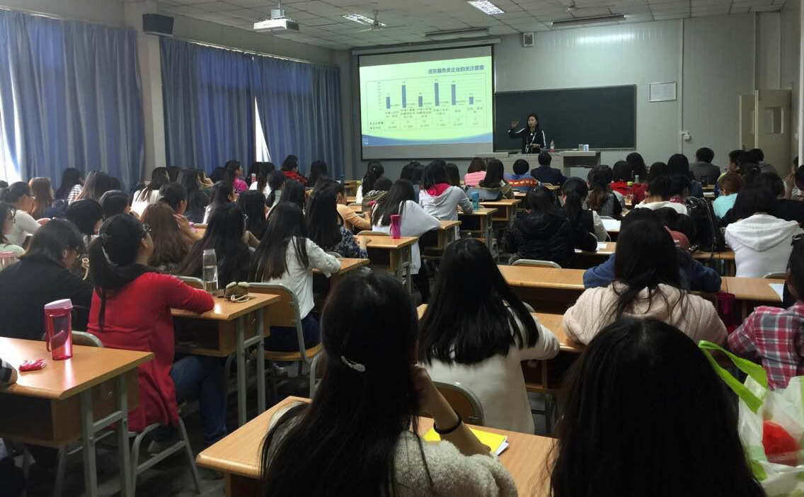 在随后的宣讲会上,来自中国译协的长孙老师围绕翻译职业前景、LSCAT项目分阶段测评、口译笔记等方面向同学们展开讲述。