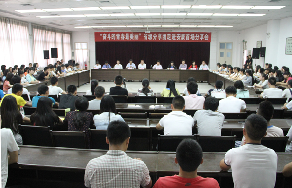 5月7日,“奋斗的青春最美丽”省级分享团走进安康系列分享活动首场集中分享会在在我校江南校区图书馆六楼报告厅举行,我校160余名青年学生代表参加了本次活动。团省委副书记徐永胜,我校党委副书记胡鸿晓,团委副书记李光梓出席活动,团市委副书记、党组副书记陈磊主持活动。