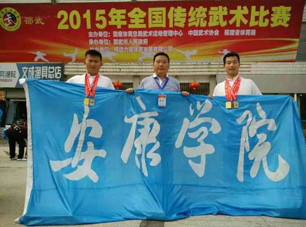 我校代表队由体育系主任冯德学担任领队,青年教师郭西魁、蔡龙两位运动员组成,在代表安康学院同时也代表陕西省参加了比赛。经过3天的激烈角逐,我校武术队共取得了1金、2银、1铜的优异成绩,其中:两人形意拳徒手对练获得金牌,郭西魁获得红拳拳术银牌,蔡龙获得形意拳拳术银牌和形意朴刀铜牌。此外,冯德学被大会评为武德风尚奖教练员,郭西魁、蔡龙两位老师被评为武德风尚奖运动员。