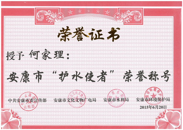 为了表彰在南水北调中线工程保护水源中作出突出贡献的个人,安康市委宣传部、市文化文物广电局、市环境保护局、市水利局等四家单位在2015年6月20日汉江龙舟节之际开展了首届安康市“护水使者”评选活动,我校政史系主任何家理教授获得首届安康市“护水使者”荣誉称号,并推荐为龙舟节龙头点睛。