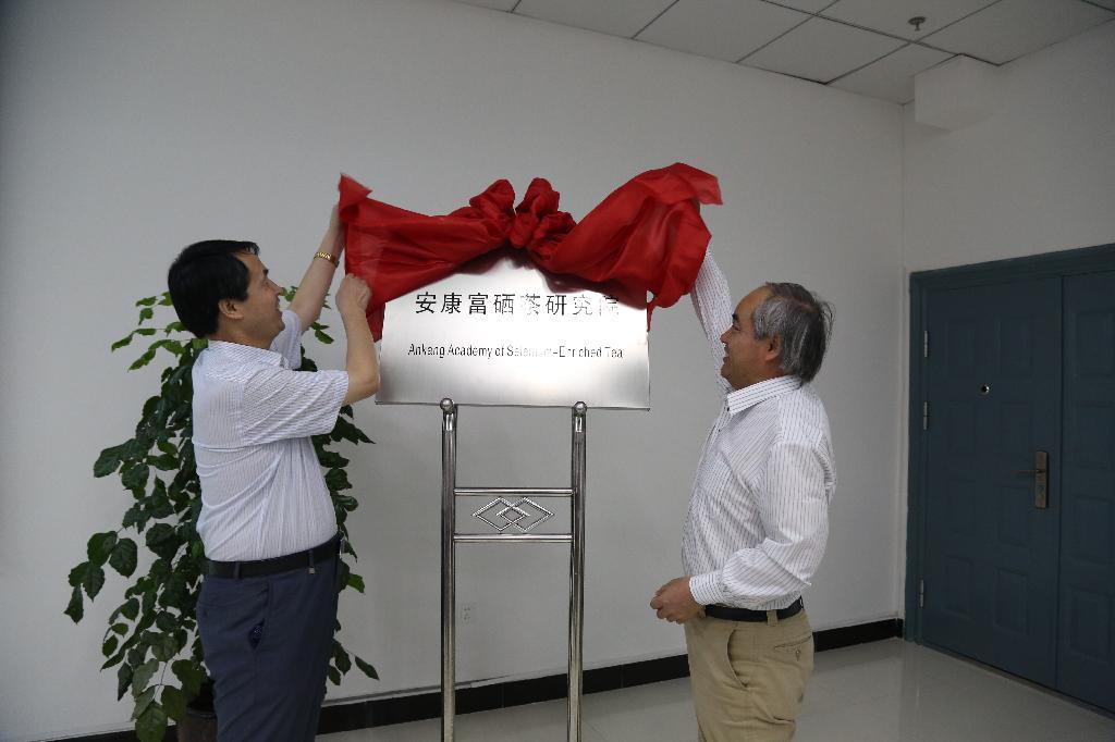 王国良和盛军共同为“安康富硒茶产业研究院”揭牌并合影。