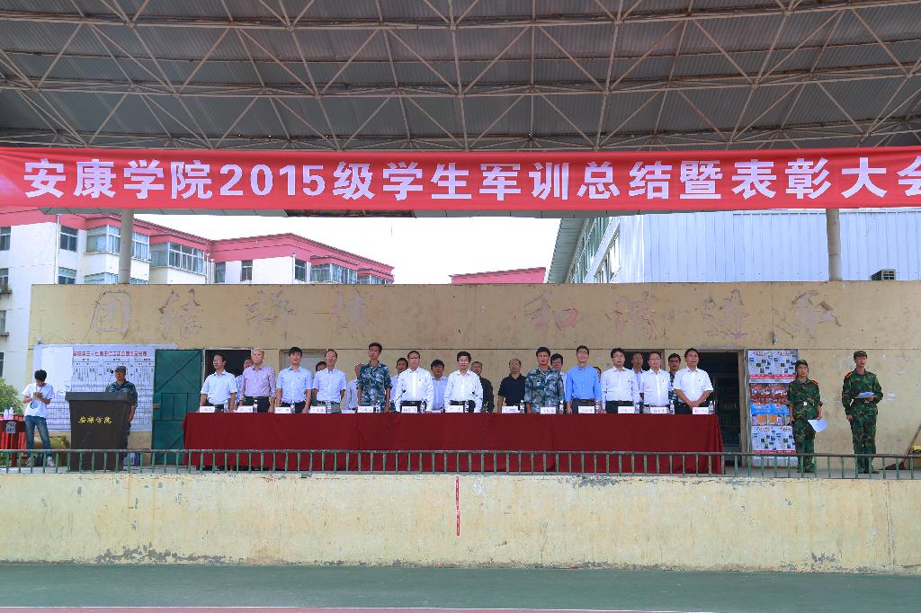 9月25日下午,我校在江南校区操场隆重举行2015级学生军训总结暨表彰大会。安康学院校长陈刚,党委副书记胡鸿晓,副校长向纪明,中国人民解放军空军少校参谋、军训团团长王旭铭,军训团参谋长吴勇睿,学校党政办、宣传部、学工部、团委、教务处、就业处、保卫处、后勤处等相关职能部门负责人,各院系党总支书记,负责军训的辅导员,2015级受训学生出席了大会。大会由向纪明主持。