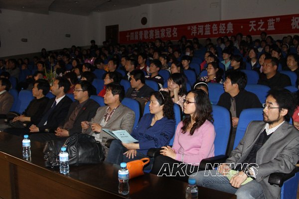 伴随着一曲奥地利音乐大师莫扎特的艺术歌曲《亲切的平静》,音乐会拉开了帷幕,随后的《一杯美酒》、《母爱》、《火焰在燃烧》等歌曲将现场的气氛一次次推向高潮。艺术系教师杜恩波、鄢志丽友情演唱了《举杯吧朋友》,精彩的演出博得了观众阵阵掌声。最后音乐会以一曲由张慧、肖剑演唱的二重唱《说给大海》中圆满结束。