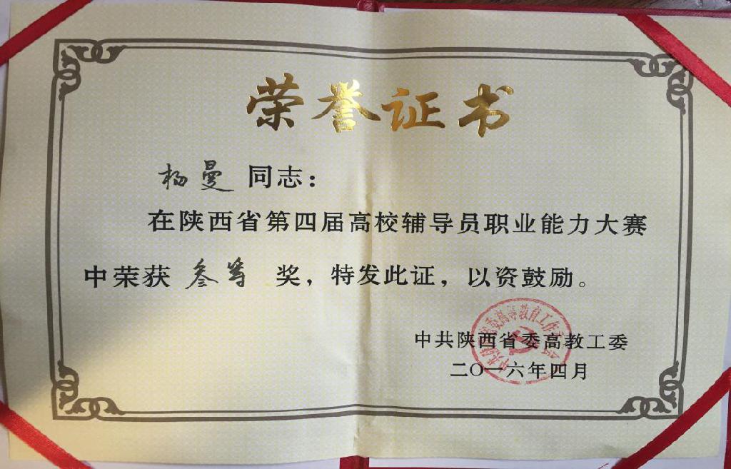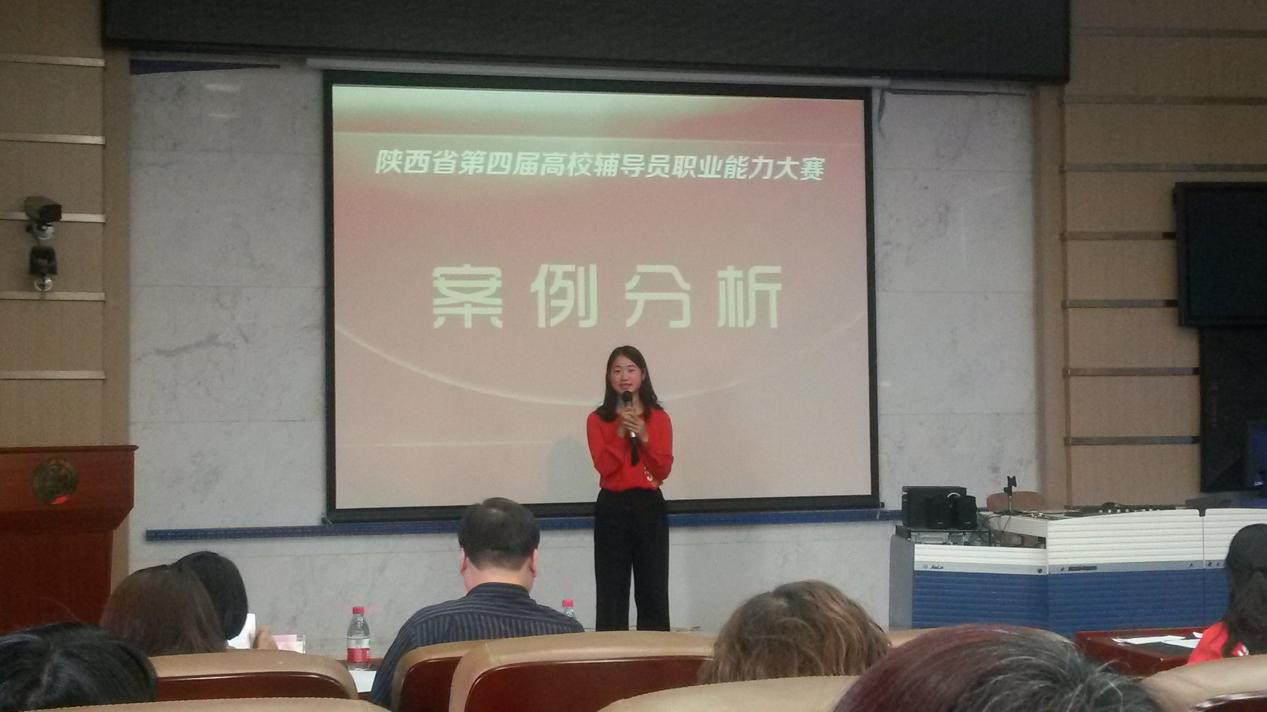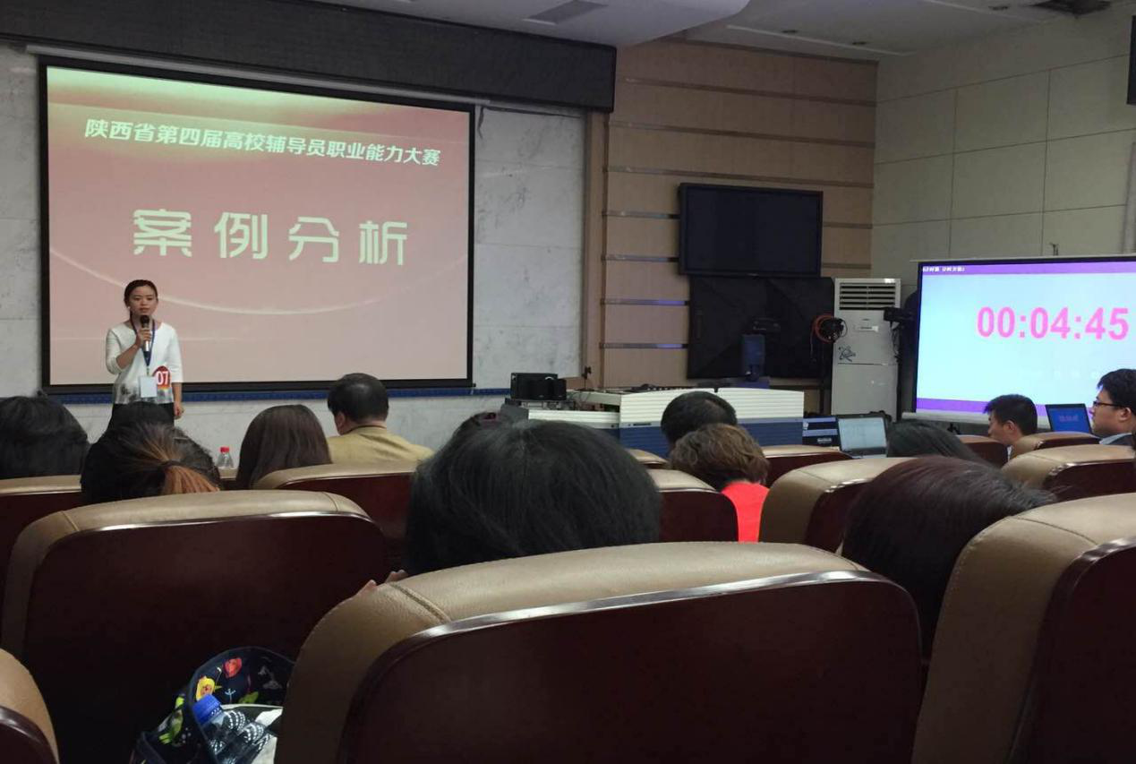 本届大赛由中共陕西省委高教工委主办、陕西省普通高校辅导员培训与研修基地(西北大学)承办。大赛实行分阶段淘汰制,第一阶段包括基础知识测试、网文写作、主题班会视频展示、案例分析等四个环节,第二阶段是主题演讲,第三阶段为谈心谈话情景再现环节。通过三个阶段六个环节的赛程全方位考察辅导员的知识积累、写作水平、沟通能力、分析判断能力、语言表达能力、解决实际问题能力等各种职业技能。我校学工部为参加本届辅导员职业能力大赛做了认真准备,组织校赛遴选,邀请专家指导,为选手获得佳绩打下了坚实基础。比赛中,杨曼和艾蕾凭借扎实的专业知识、良好的心理素质和出色现场表现,赢得评委的好评,充分展示了我校辅导员良好的精神风貌和职业素养。