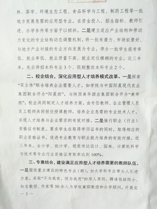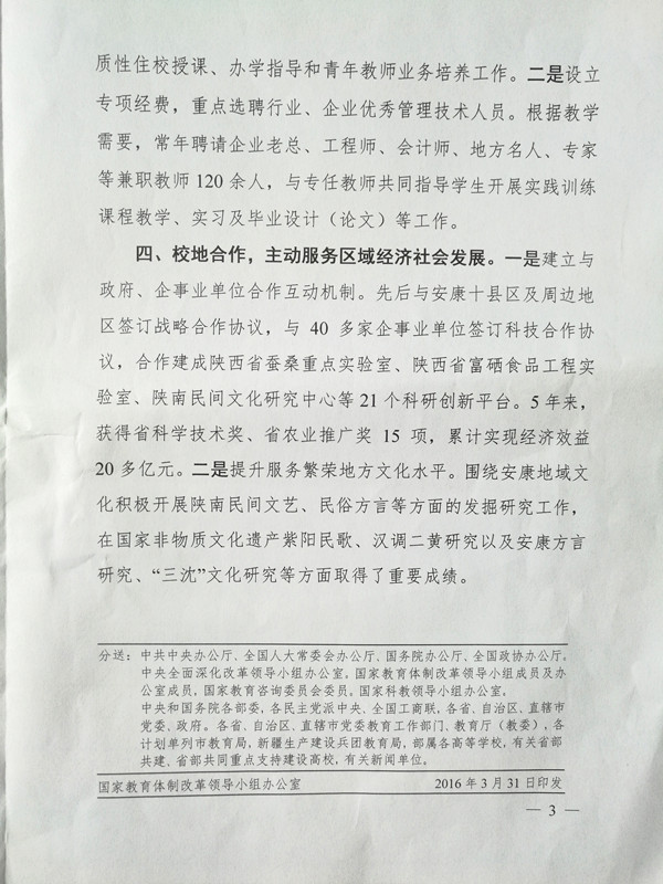 3月31日,国家教育体制改革领导小组办公室编发的《教育体制改革简报》([2016]第20期),刊发了题为《安康学院:立足秦巴探索应用型特色发展之路》的文章,从面向需求,优化学科专业结构布局;校企结合,深化应用型人才培养模式改革;专兼结合,建设满足应用型人才培养需要的教师队伍;校地合作,主动服务区域经济社会发展四个方面详细报道了我校在地方高校探索应用转型发展之路上取得的成绩与积累的经验,现将全文影印版分享给大家。