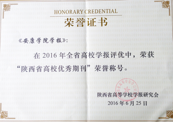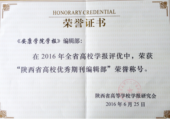 6月29日至7月2日,陕西省高校学报研究会2016年学术年会在延安召开,中国社会科学评价中心3位专家以及全省170多名期刊界同仁出席会议。会议公布了“四优”(优秀期刊、优秀期刊编辑部、优秀编辑人员、优秀编辑学论著)评选结果,并对获奖单位及个人进行了表彰。我校学报被评为“陕西省高校优秀期刊”,学报编辑部被评为“陕西省高校优秀期刊编辑部”。