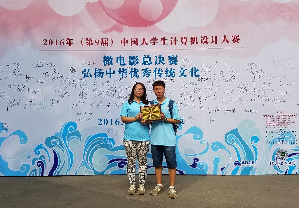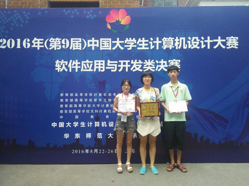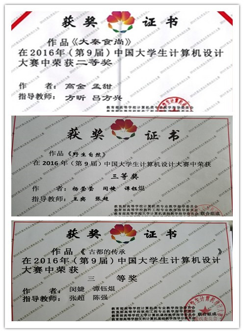 2016年7月27日~8月26日,第9届中国大学生计算机设计大赛全国总决赛在安徽大学、北京语言大学和华东师范大学按“数字媒体专业类”、“微电影类”、“软件应用与开发类”三个类别分别举行,来自全国各类院校的2000多支队伍参加了比赛。我校推选了3支队伍参加比拼,最终夺得二等奖1项和三等奖2项。