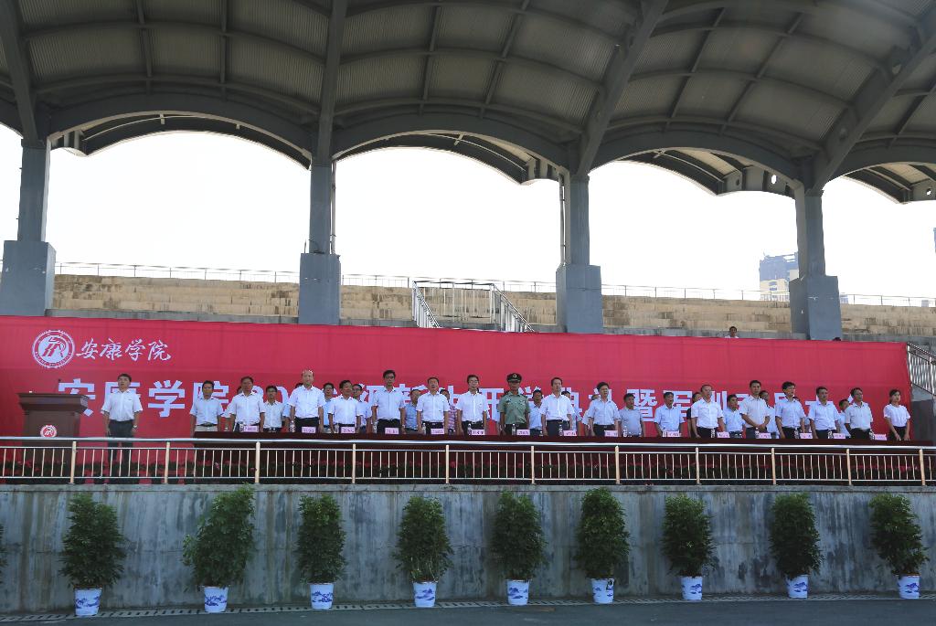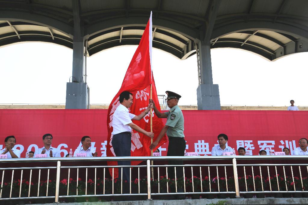校党委书记王国良为军训团授旗并宣布军训开始,校长陈刚致辞。党委副书记胡鸿晓主持大会。