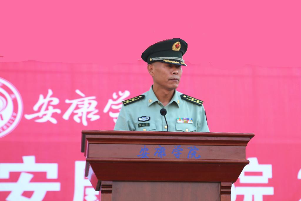 中国人民解放军某部参谋长郭广宝中校作了军训动员,他向即将参加军训的2016级新生表示热烈祝贺,寄语广大新生不仅要有“诗和远方”,也要有心系国家兴亡、民族复兴的家国情怀,同时希望所有承训官兵遵守纪律、尊重规律、科学施训,高标准完成军训任务。