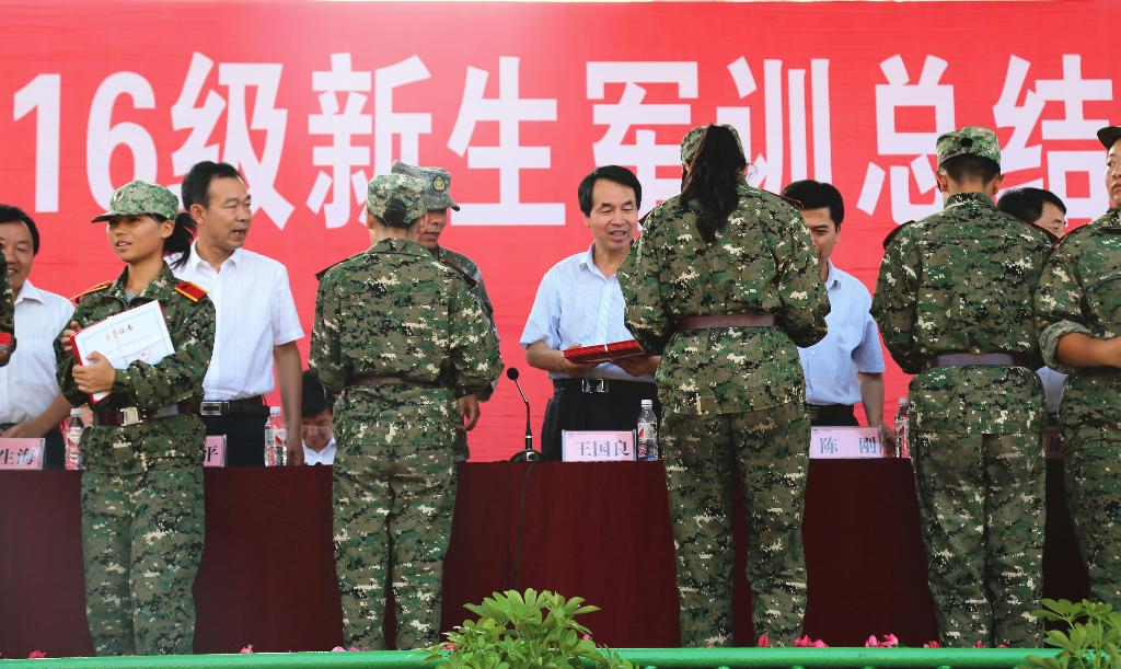 闵小平宣读了表彰决定。13个连队被评为“军训先进集体”,7名辅导员被评为“军训优秀指导员”,80名同学被评为“军训先进个人”。学校领导和承训部队领导为先进集体和个人颁发了荣誉证书。