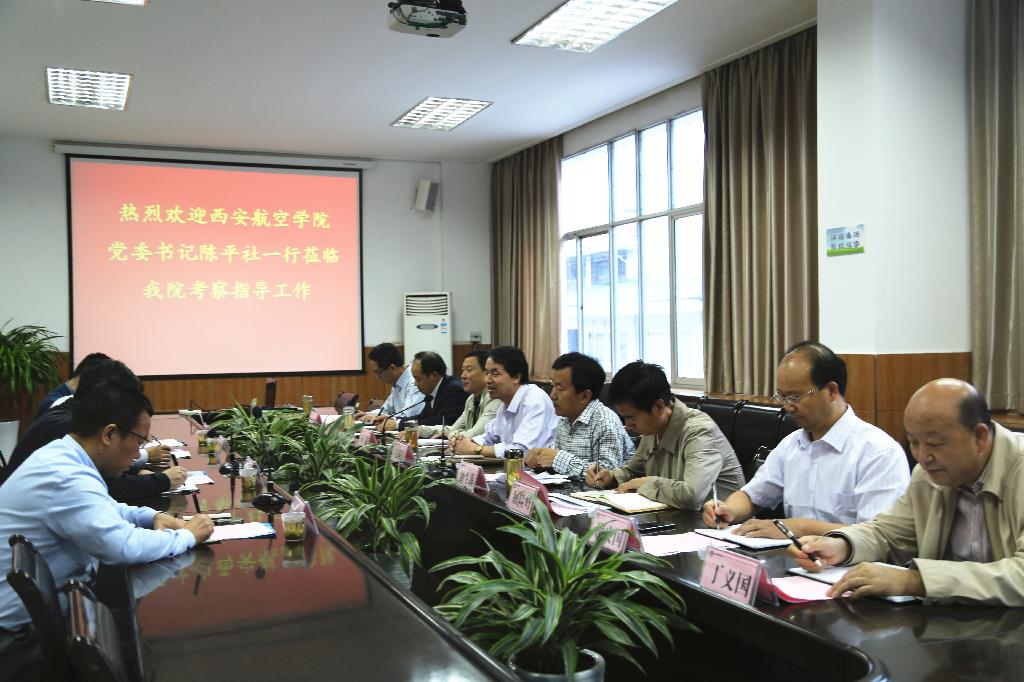 9月21日上午,西安航空学院党委书记陈平社携校工会、发展规划处、科技处、招就处等部门负责人来学校考察交流。我校党委书记王国良、副校长钟生海带领党政办、组织部、发展规划处、工会、人事处、招就处等有关部门负责同志热情接待了陈平社一行,并于江南校区第一会议室举行交流座谈会。