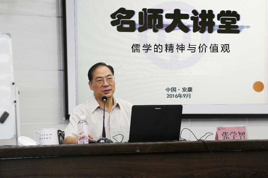 9月25日上午,由安康学院与中国银行安康分行联合举办的《名师大讲堂》系列学术讲座,在我校图书馆六楼报告厅隆重开讲。首期讲座特邀北京大学哲学系教授、博士生导师张学智主讲《儒学的精神与价值观》。我校师生代表、中国银行安康分行员工代表及特邀嘉宾近200人聆听了本期讲座。安康学院副校长向纪明、中国银行安康分行行长雷晓宇出席开讲仪式并分别作了讲话。