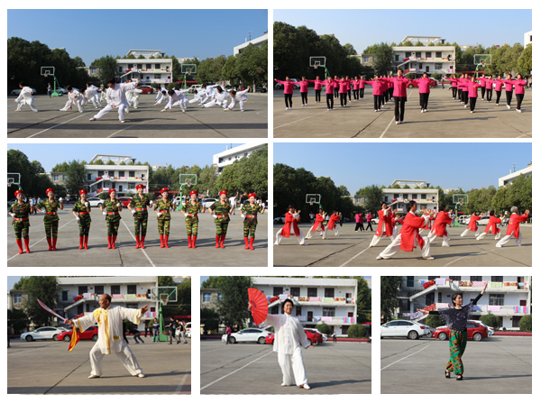 开幕式结束后,清新悠扬的乐曲响起。在太极拳队全体队员表演的《24式太极拳》中拉开帷幕,接着《功夫扇》、《24式太极剑》、《游龙拳》、《女兵瑶》、独舞《一壶老酒》、《你笑,我也笑》、群舞、健身操等12个节目逐一登场展演。他们表演的太极拳,刚柔并济,转运灵巧稳健;太极剑,体静神舒,姿态优美潇洒;功夫扇,轻灵沉着,姿势舒展大气;舞操表演者们穿着整齐的服装,踏着或矫健、或优美、或洒脱的步伐,随着伴奏乐的旋律翩翩起舞,充分展现了各活动团队平时的锻炼成果和离退休教职工健康向上的精神风貌。