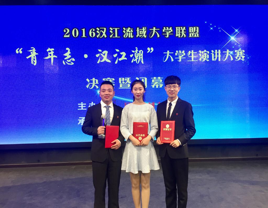 由我校团委办公室主任何媛带队,邸玲、余珊、李景林3位老师指导,文学与传媒学院的第五龙龙、张文燕,外语学院王文轩3名同学凭借在《志存高远,脚踏实地》、《我是汉江边上的路人甲》、《四季汉江,青年梦想》中的精彩演讲均获得本次大赛个人二等奖,展现了个人风采,为学校赢得了荣誉。