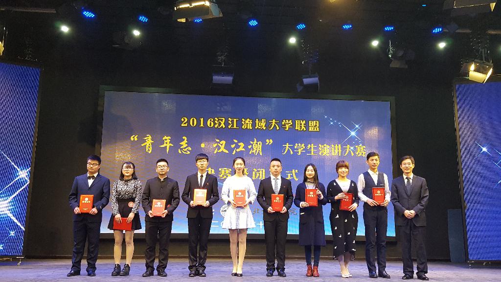 据悉,2016汉江流域大学联盟“青年志·汉江潮”大学生演讲大赛旨在加强汉江流域大学联盟各成员单位交流、沟通与合作,更好地传播汉江流域大学联盟的品牌和形象,提升其影响力、辐射力与带动力,增强联盟内青年学生服务汉江生态经济带开放开发的责任意识和担当能力。本次大赛不仅进一步加强了我校与其他汉江盟校之间的交流,也彰显了我校优秀学子积极向上的青春风貌。